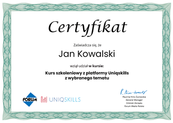 Po ukończeniu kursu otrzymasz imienny certyfikat potwierdzający zdobycie kompetencji w obszarze leadershipu, zarządzania zespołem i podejmowania decyzji menedżerskich. Certyfikat możesz dodać do swojego profilu LinkedIn, dołączyć do CV lub wykorzystać jako potwierdzenie rozwoju kompetencji liderskich w organizacji.