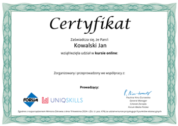 Poświadczający ukończenie kursu. Jesteśmy dumni z tego, że nasz kurs daje uczestnikom możliwość zdobycia certyfikatu potwierdzającego zdobyte umiejętności i wiedzę. To ważne osiągnięcie, które może pomóc w rozwoju kariery i otwierać nowe możliwości zawodowe.
