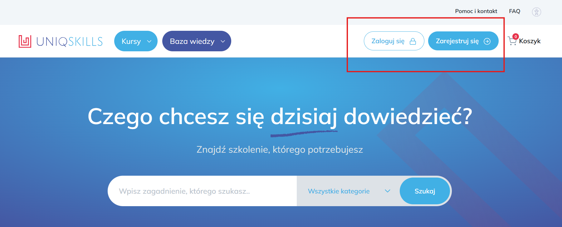 Po lewej stronie znajduje się „Katalog kursów” – który bezpośrednio przeniesie Cię do strony www.uniqskills.com/pl/kursy gdzie możesz zobaczyć co nowego dla Ciebie przygotowaliśmy, co aktualnie jest w ofercie i skorzystać z innych kursów.