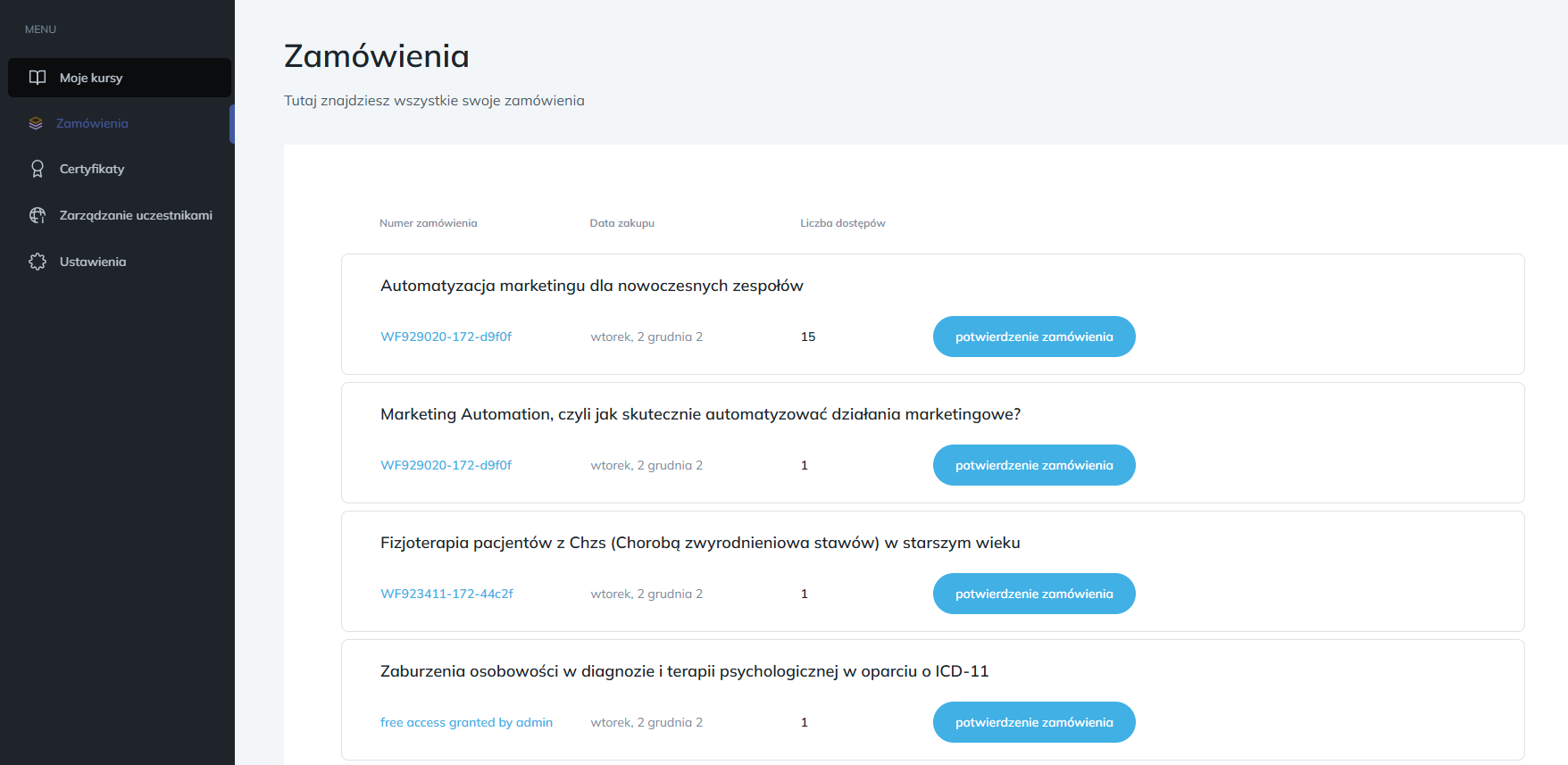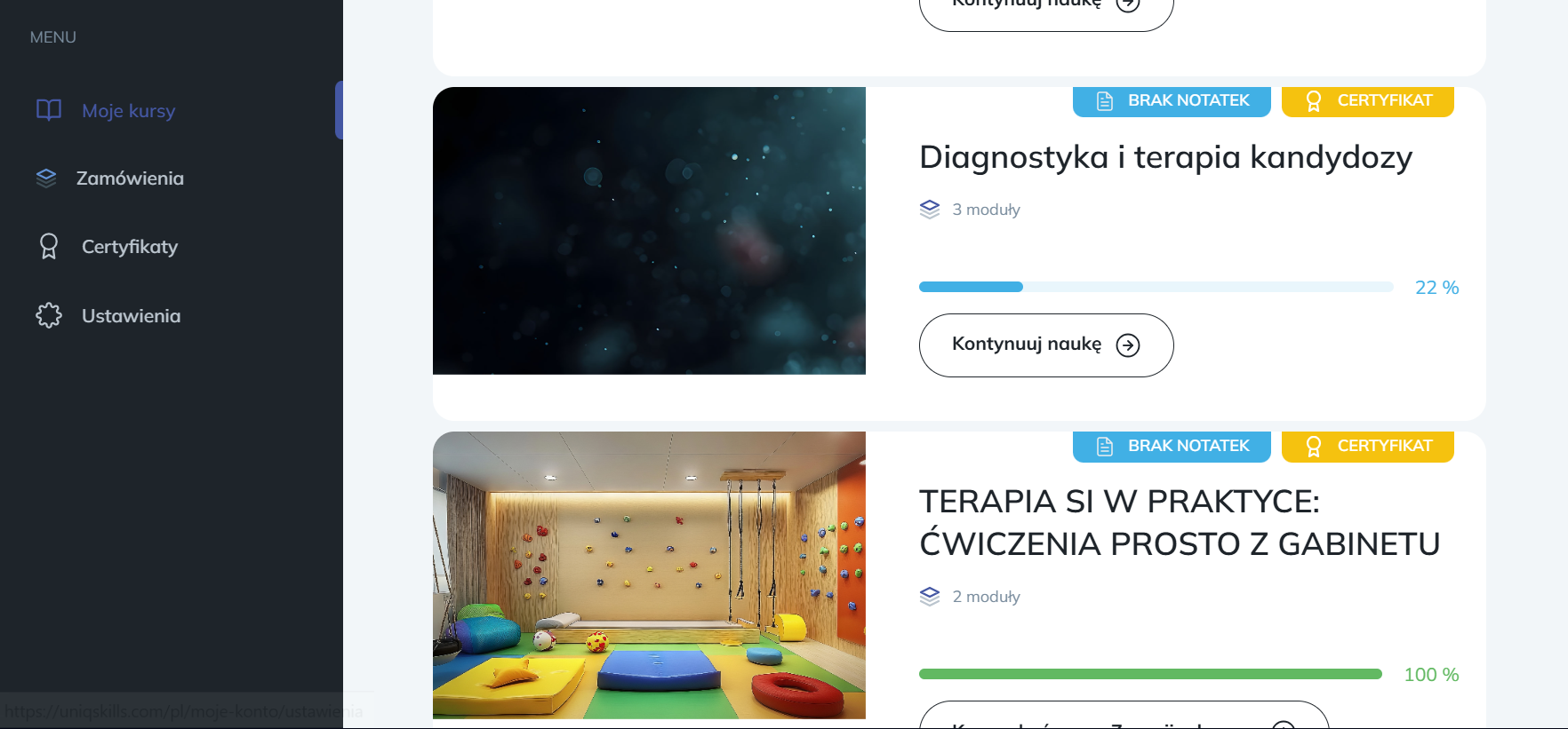 Kliknięcie w odnośnik „Moje kursy” pozwala na wyświetlenie wszystkich kursów dostępnych na Twoim koncie.