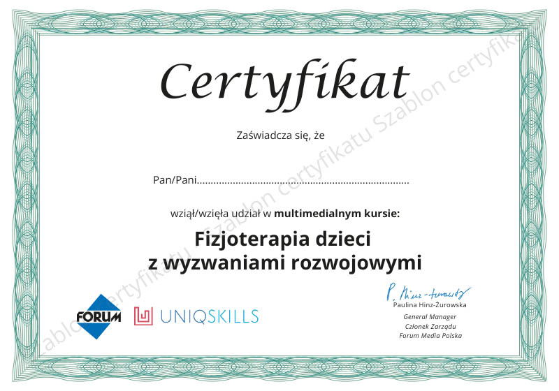Jeśli chcesz otrzymać drukowany certyfikat potwierdzający Twój udział w kursie Fizjoterapia dzieci z wyzwaniami rozwojowymi dodaj kurs do koszyka i wybierz dodatkową opcję certyfikatu papierowego.